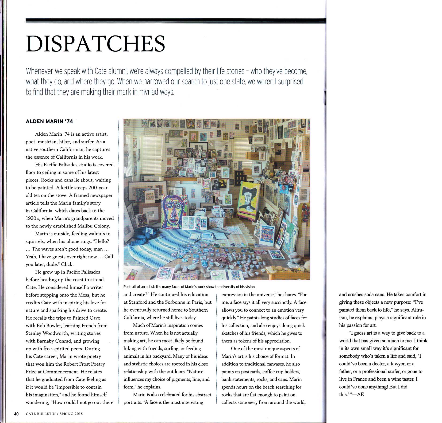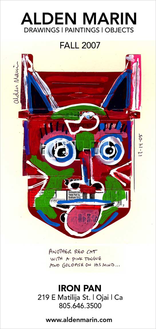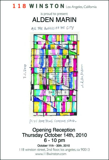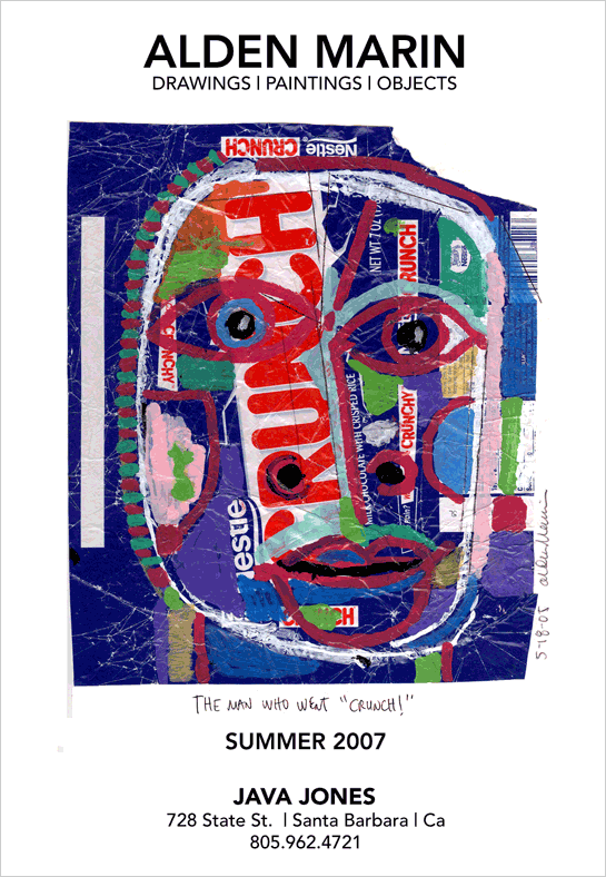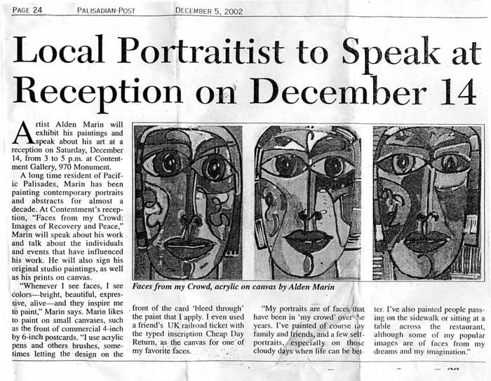 | "French philosopher Emmanuel Levinas argues that the force of the face is always an ethical force before it is an ontological one. He is drawn back to the face--the demanding, transcendent, infinitely finite face--over and over in his thinking. This repetition, and the realization that founds it, is at work as well in the painting of Alden Marin. So often returning to the face, working out the meaning of the face, Marin explores the nature of an encounter with the Other, an embodied Other that more often than not is a manifestation of hope. With careful attention to color and space, Marin not so much constructs his subjects as allows them to appear on his canvas--a canvas which is, so often, a found-object, an article of trash or discard, itself an unwanted and overlooked Other. It is thus through both a process of reclamation and salvation that Marin founds his hope and works his alchemy, turning shape into gaze, line into Being. And as his deconstructed subjectivities--marginally identified, thumb-printed, and longing--stare through us like fragmented stained glass faces, we discover that they are ultimately staring with us, all of us tied together in a force that is always already an ethical force before it is an ontological one."