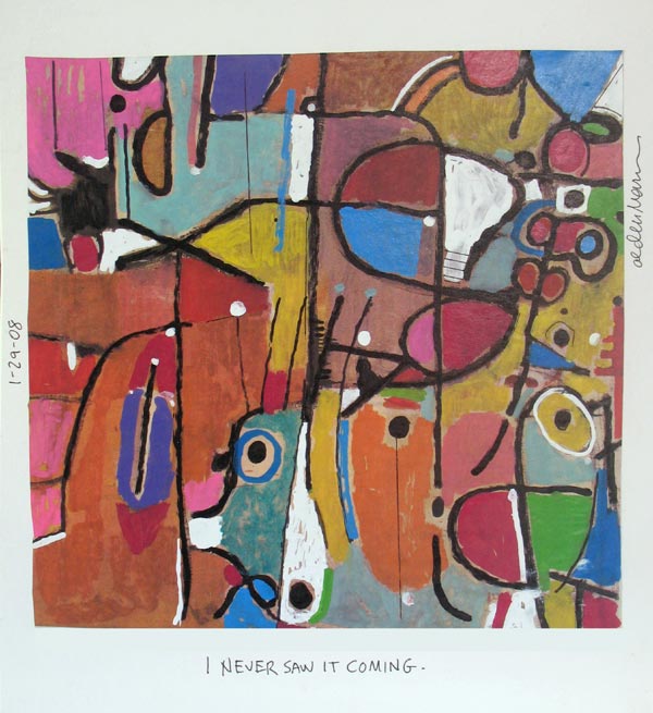 Never Saw it Coming 2008. 11 1/2 x 12 1/4" enamel pen, whiteout, ballpoint, crayon on paper Enlarge Image