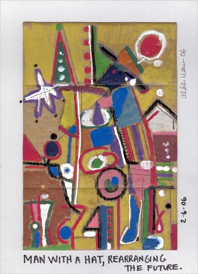 Man With A Hat 2006, 8 3/4 x 12" Acrylic paint and white out with pencil and pen on cardboard box scrap.