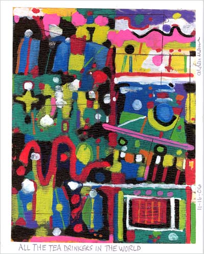 All The Tea Drinkers in the World 2006, 7 1/2 x 9 1/2" Acrylic paint and white out with pen on brochure fragment.