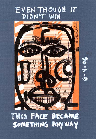 Acrylic marker, white out and felt pen on a lottery ticket stub.