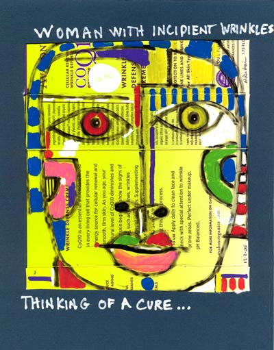 Acrylic paint, white out and ball point pen on a Point of Sale item.