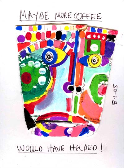 Maybe More Coffee Would Have Helped 2 1/4 x 3 1/2" Acrylic paint, ballpoint and white out with pencil, On a flattened Starbucks cup.